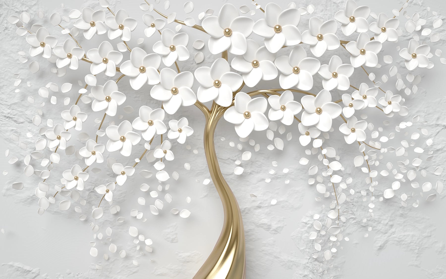 Gemütlich und warm wird diese Trompe-l'oeil-Baumtapete mit weißem Blumen-3D-Effekt Ihre Augen erfreuen. Die Blumen auf dieser Fototapete erwachen wie von Zauberhand zum Leben, wenn Licht in den Raum fällt. Dieses prächtige Panorama-Wanddekor verleiht Ihrem Interieur einen Hauch von Originalität.