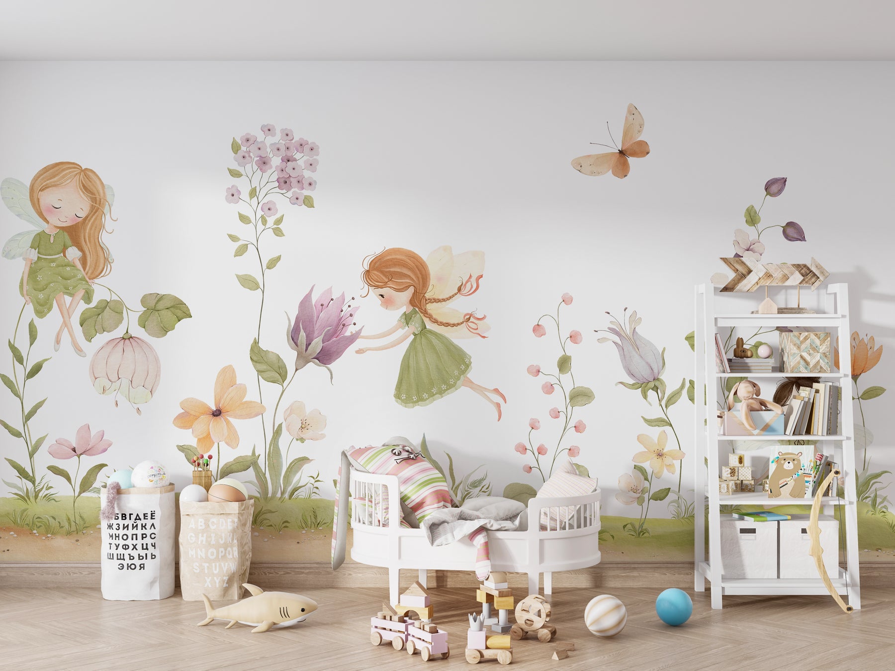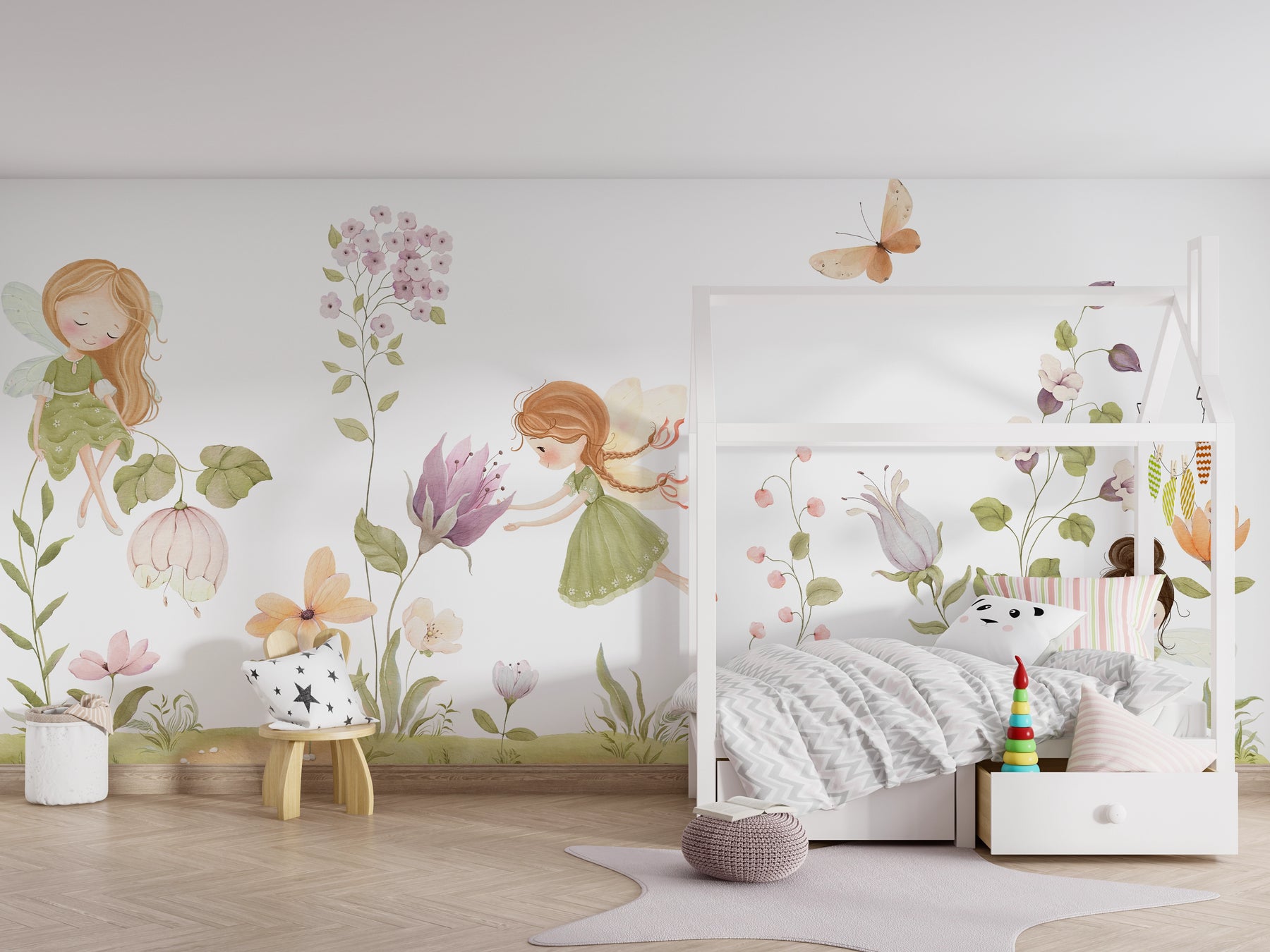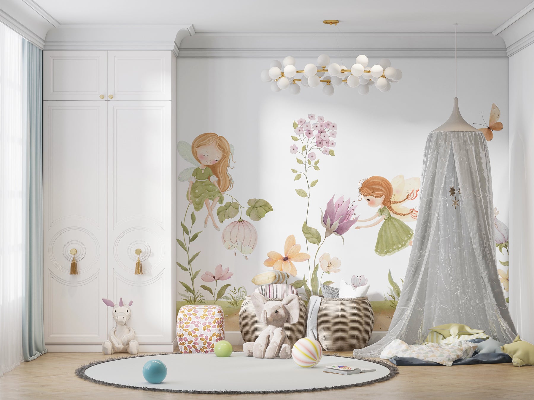 Die Panoramatapete Feen des Verzauberten Gartens schafft eine sanfte und magische Atmosphäre im Kinderzimmer. Kleine Feen in Pastellkleidern bewegen sich zwischen großen, aquarellierten Blumen in einer poetischen Welt, in der Schmetterlinge und zarte Vegetation harmonisch verschmelzen. Die sanften Farben und feinen Illustrationen bringen ein Gefühl von Ruhe und Träumerei. Maßgeschneidert gedruckt und in Frankreich hergestellt, verwandelt diese Wanddekoration den Raum in einen märchenhaften Garten, der der Vorstellungskraft und der Erholung förderlich ist.