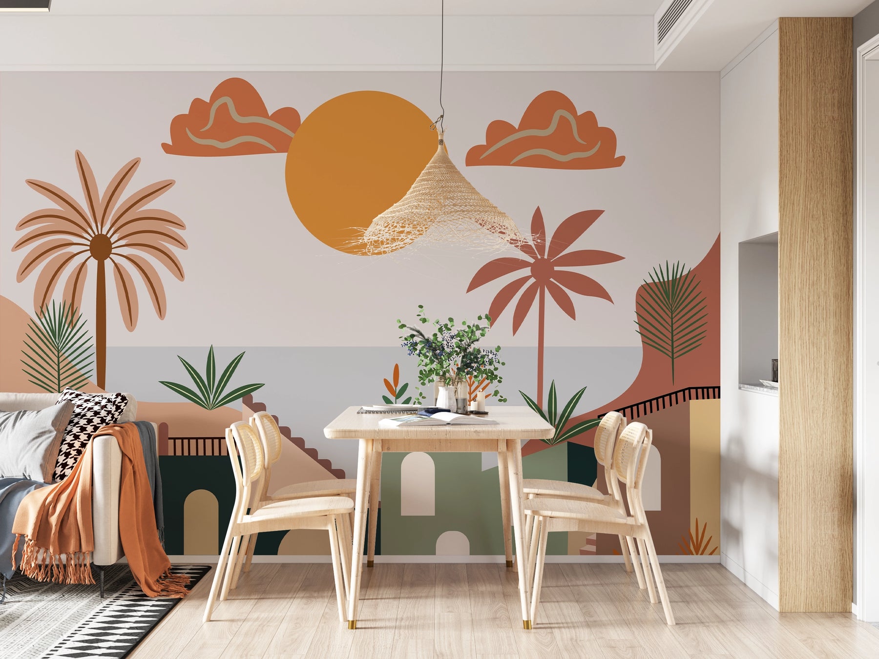 Invite the warmth and softness of the South into your interior with the Mediterranean Sun panoramic wallpaper. Its graphic shapes, inspired by Mediterranean landscapes, blend palm trees, colorful houses, and a blazing sun to create a warm and exotic atmosphere.