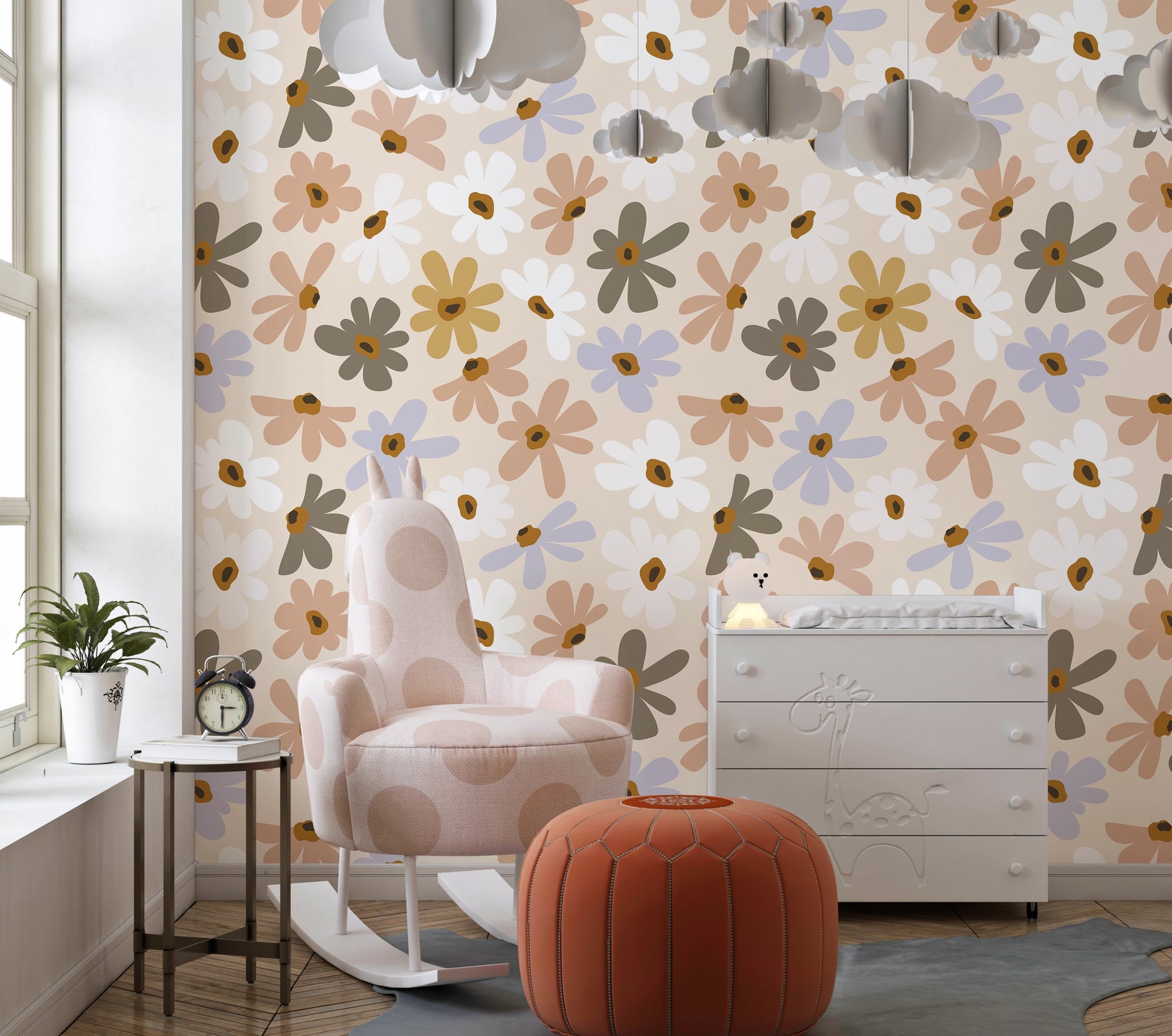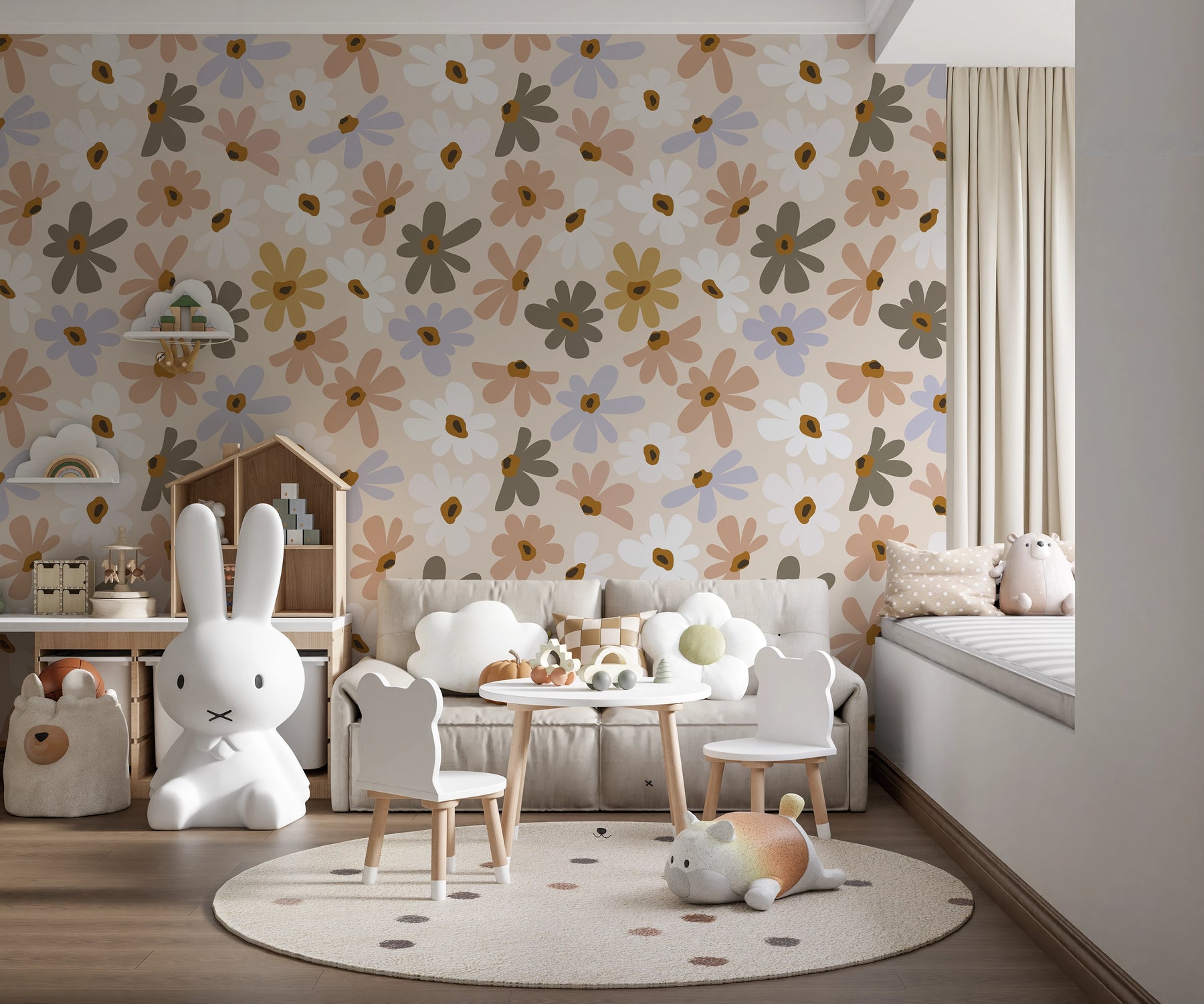 A breeze of tenderness blows over the walls with the Douceur Florale wallpaper. Its small flowers in a naive and poetic style form a delicate pattern, in powdered shades of beige, ochre, lilac, and white. This decor brings a soft and reassuring atmosphere, perfect for a child's bedroom, a nursery, or a play area.