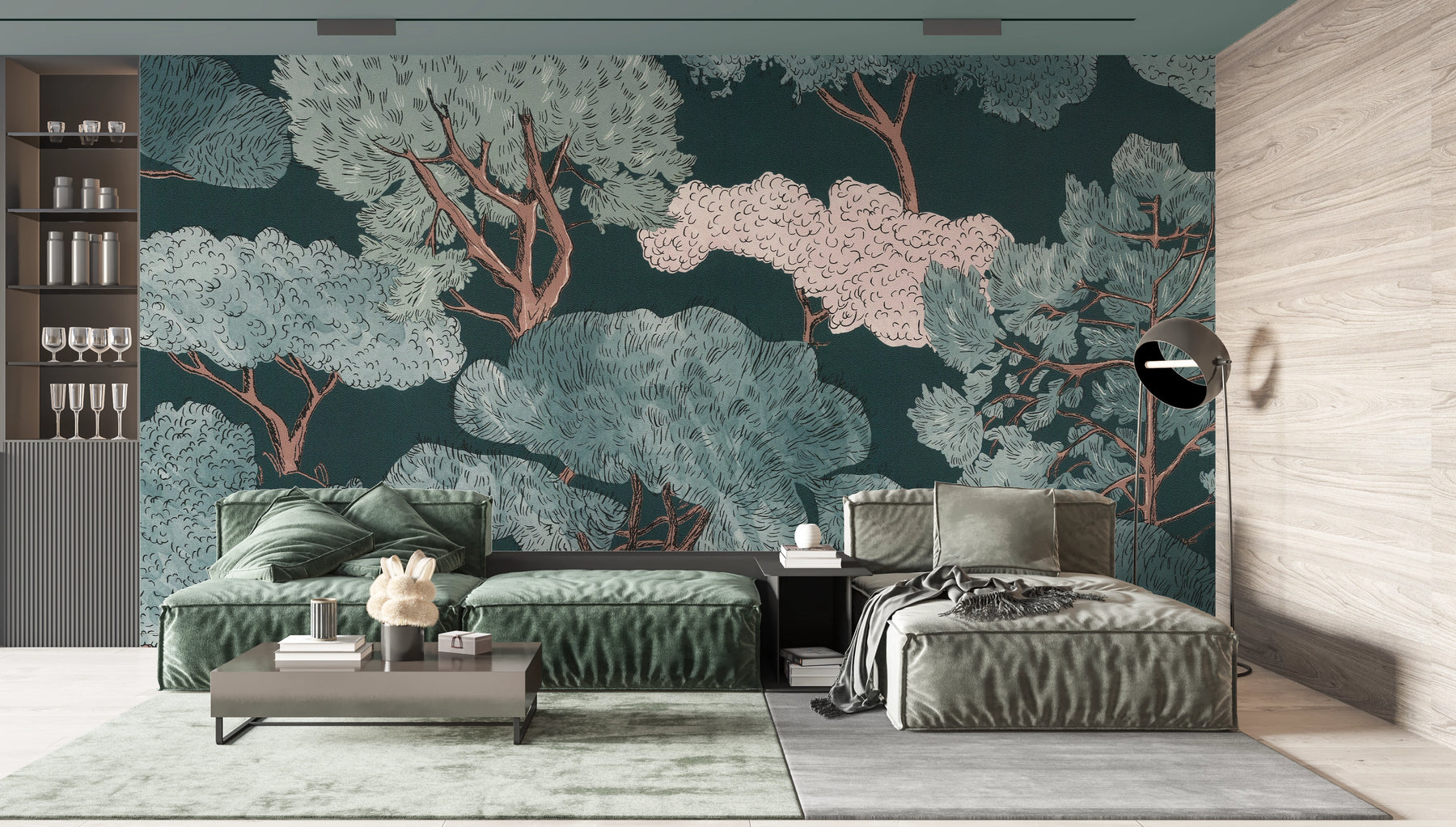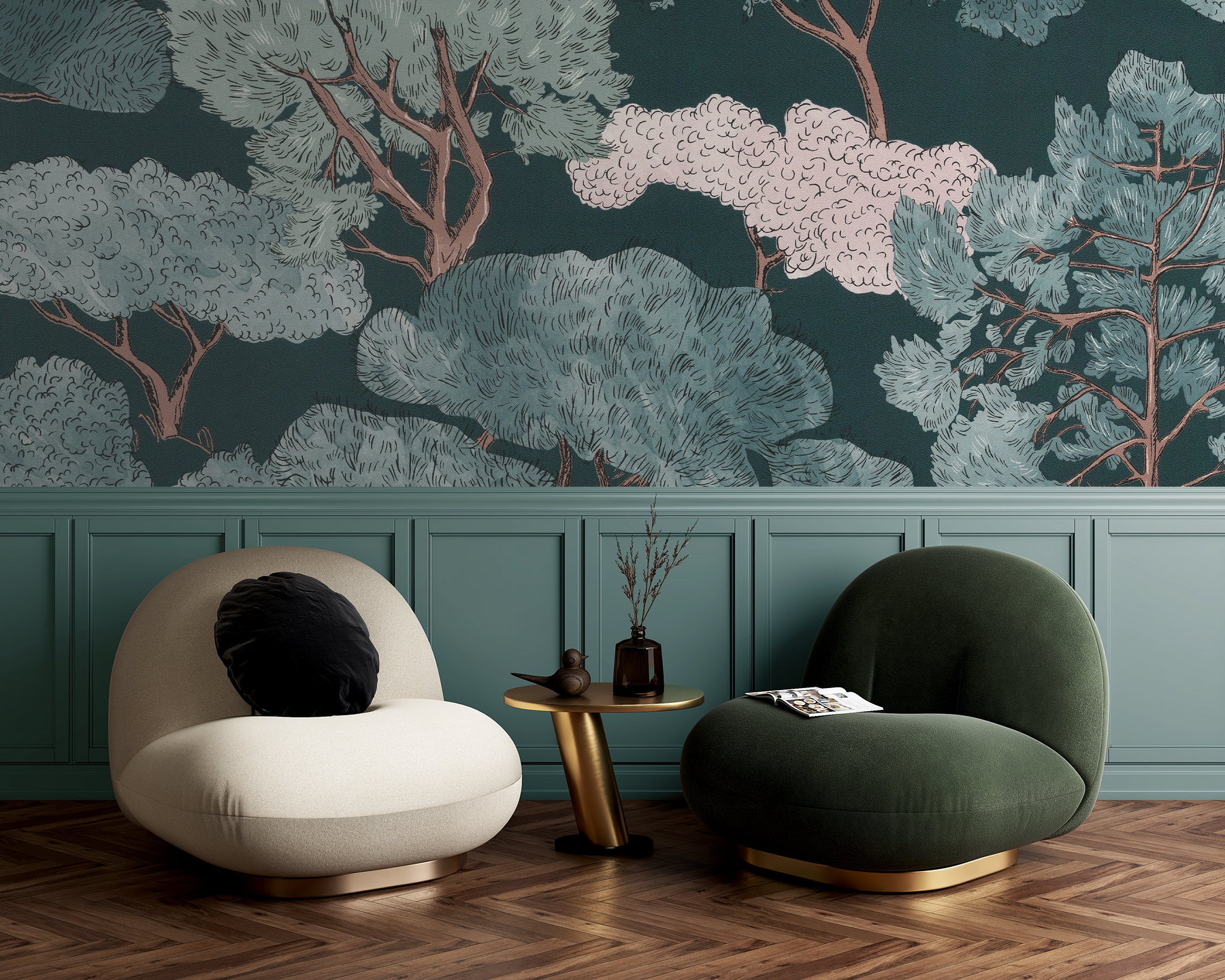 Dive into a graphic and refined universe with the panoramic wallpaper Stylized Forest. Its trees drawn in an illustrative style with emerald green hues and pink touches bring an artistic and contemporary atmosphere to your walls.