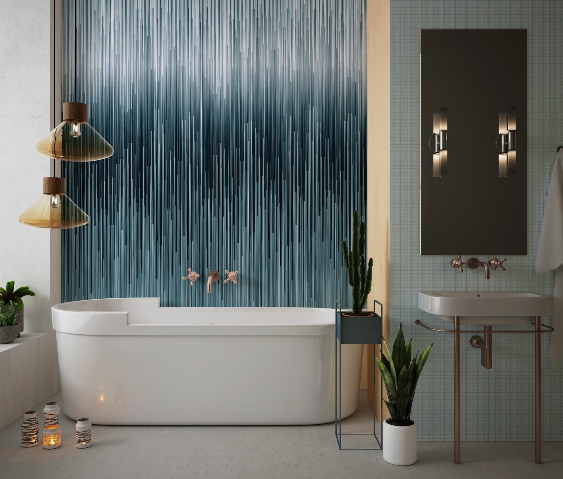 Ce décor mural s’intègre parfaitement dans une salle de bain moderne, un salon design ou une chambre parentale. Grâce à son style graphique et à ses couleurs bleu pétrole et gris acier, il sublime les espaces minimalistes comme les ambiances plus sophistiquées.
