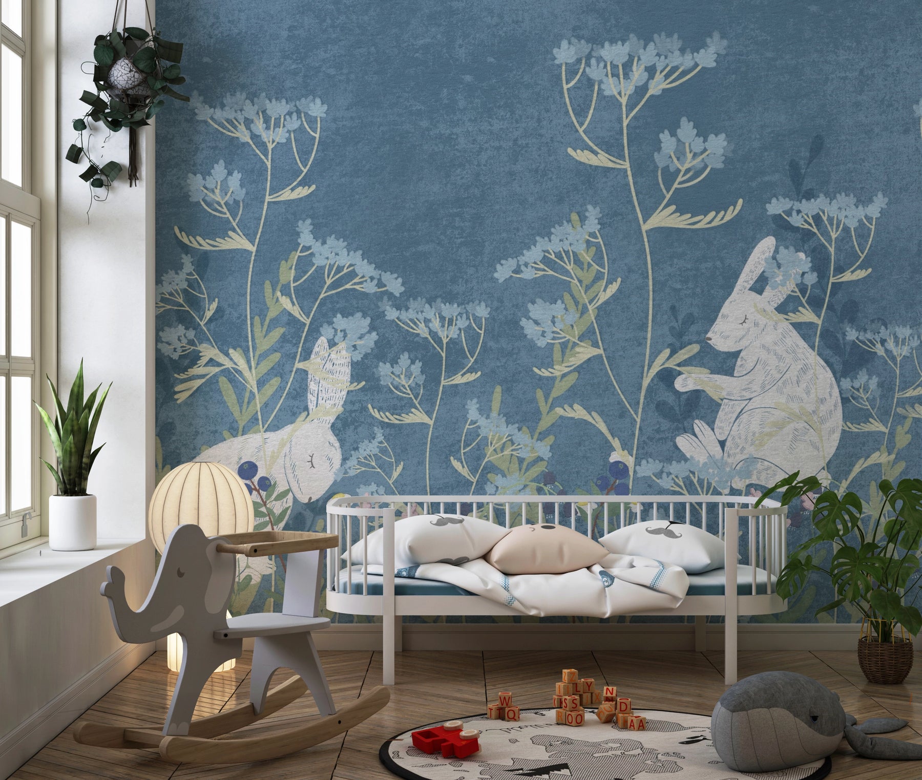 Un decorado tierno y soñador para acompañar los momentos más bonitos de la infancia. En una pradera de tonos azules y verdes tranquilizantes, encantadores conejitos juegan entre las flores silvestres y las hierbas ligeras. Este papel pintado evoca la naturaleza, la dulzura y la tranquilidad de los cuentos ilustrados.
