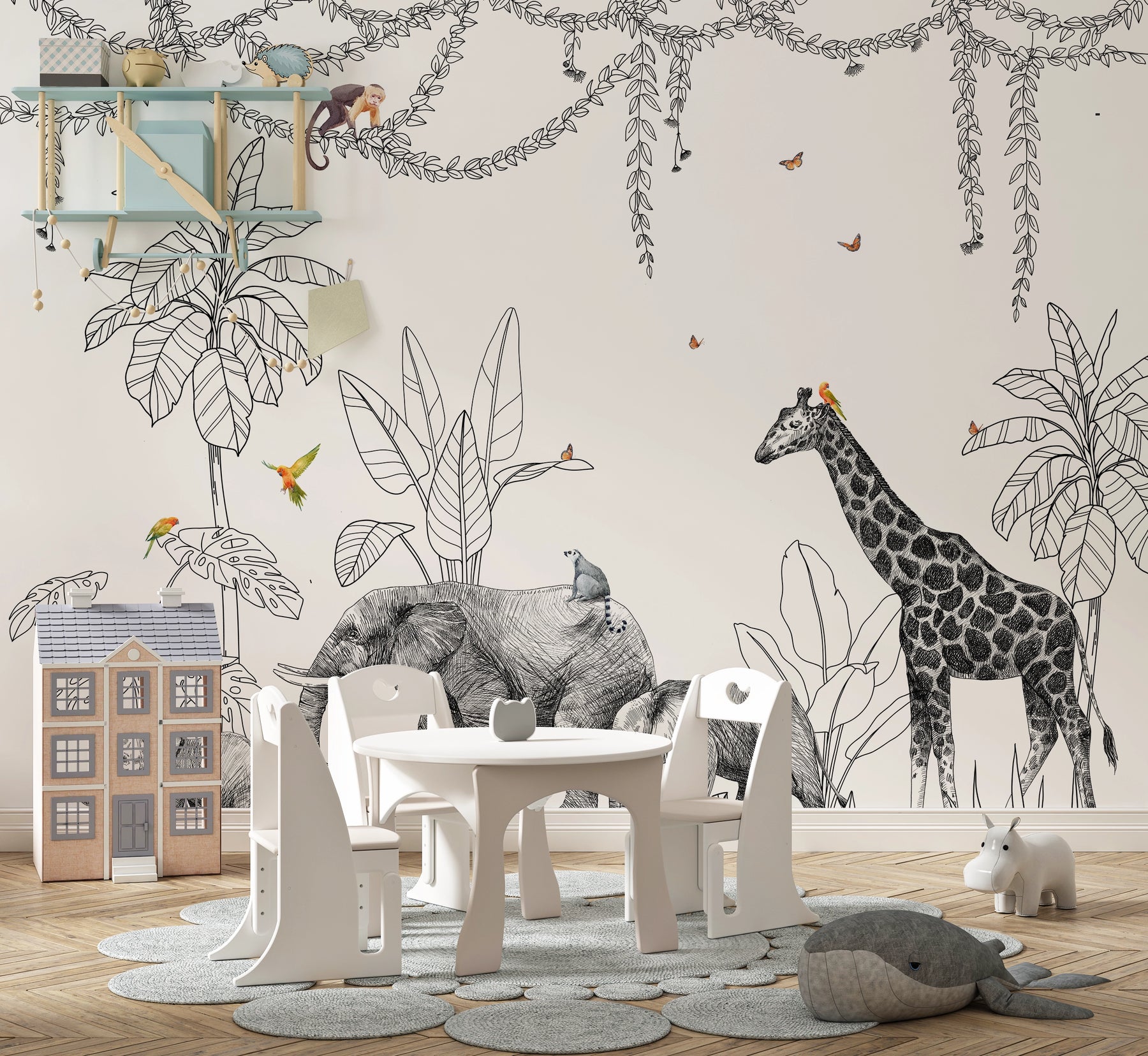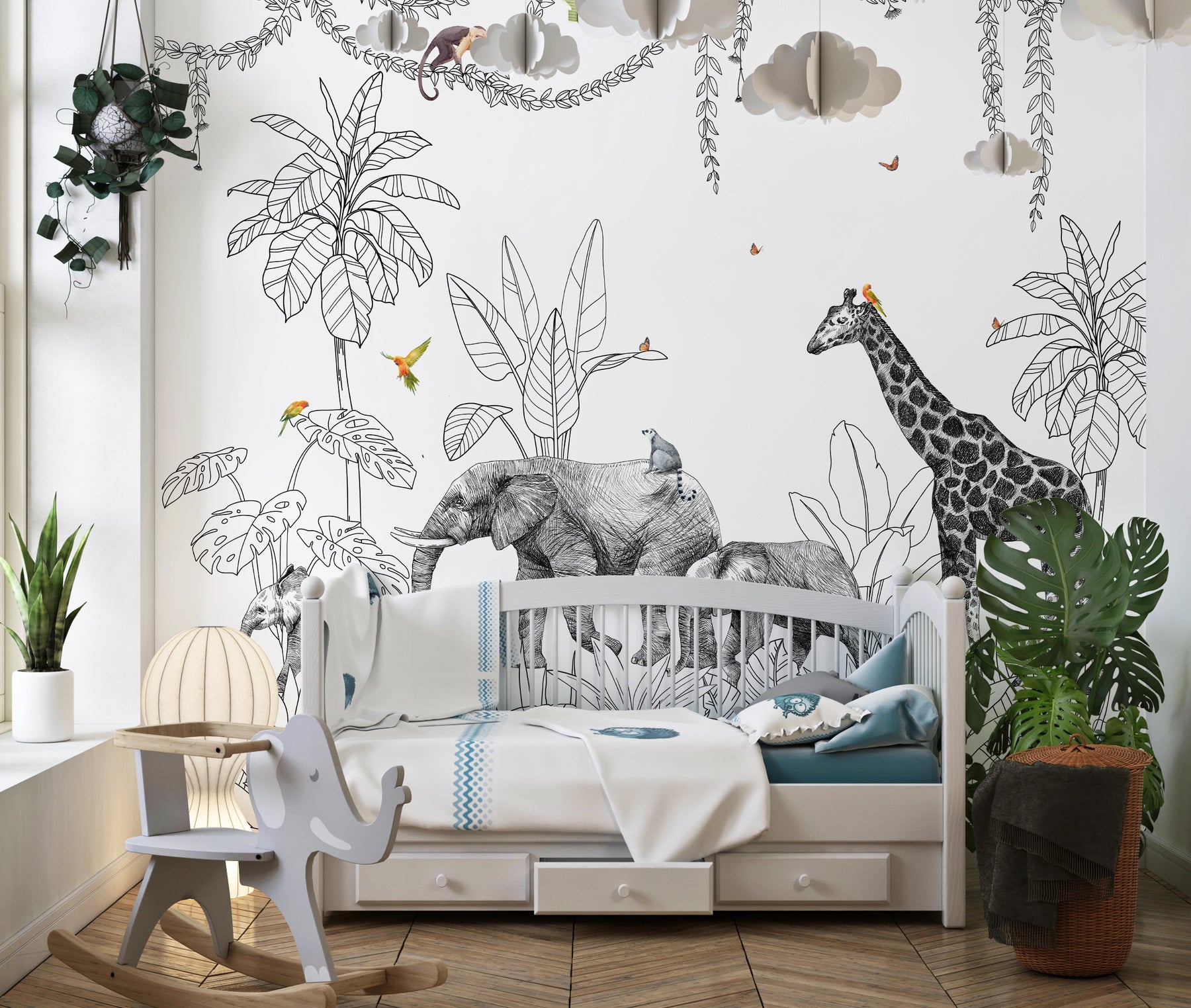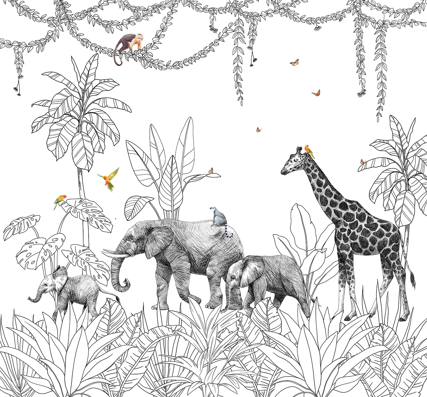 Le papier peint panoramique Safari Poétique invite les enfants à découvrir un univers doux et imaginaire, peuplé d’animaux majestueux. Éléphants, girafe et oiseaux se mêlent à une végétation dessinée à la main, mêlant traits noirs délicats et touches de couleurs légères. L’ensemble crée une ambiance tendre et élégante, parfaite pour une chambre d’enfant, une salle de jeux ou une crèche. Imprimé sur mesure et fabriqué en France, ce décor mural transforme instantanément la pièce en un petit monde de découverte, de calme et de rêverie.