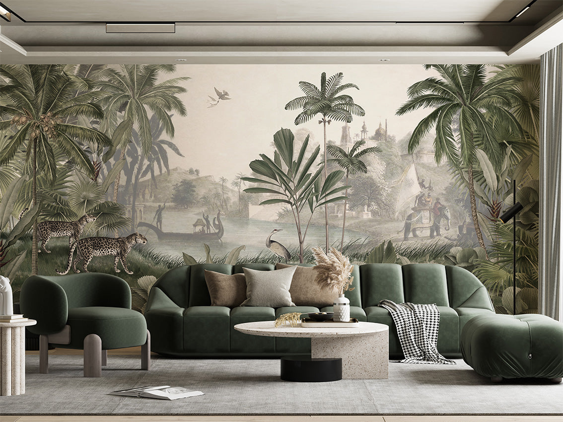 Ce papier peint panoramique jungle transforme un intérieur en décor immersif et raffiné, idéal pour un salon, une chambre, un bureau ou un espace professionnel à forte identité. Les nuances de vert profond, associées à une lumière douce et légèrement brumeuse, apportent profondeur et sérénité tout en conservant une forte présence décorative. L’équilibre entre faune sauvage et décor paysager confère une atmosphère à la fois élégante, dépaysante et intemporelle.